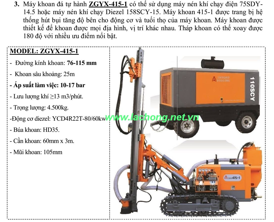 Máy khoan đá tự hành ZGYX-415-1 có thể sử dụng máy nén khí chạy điện 75SDY-14.5 hoặc máy nén khí chạy Diezel 158SCY-15. Máy khoan 415-1 trang bị hệ thống hút bụi tăng độ bên cho động cơ và tuổi thọ của máy khoan.