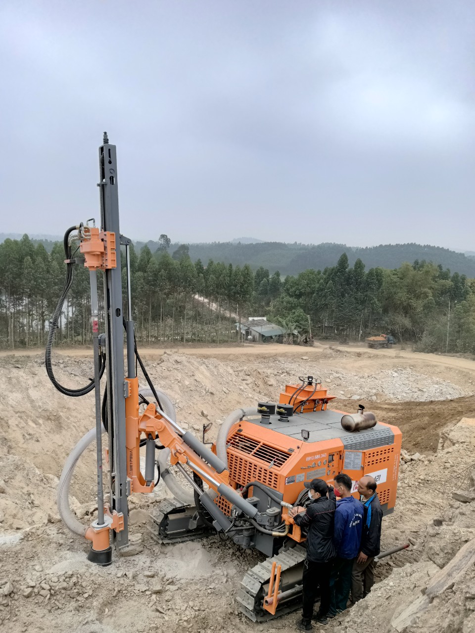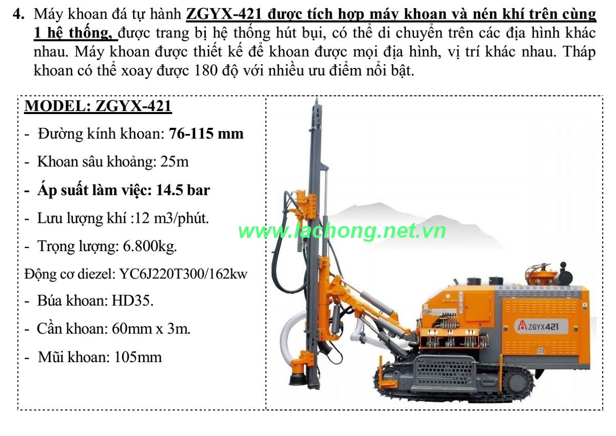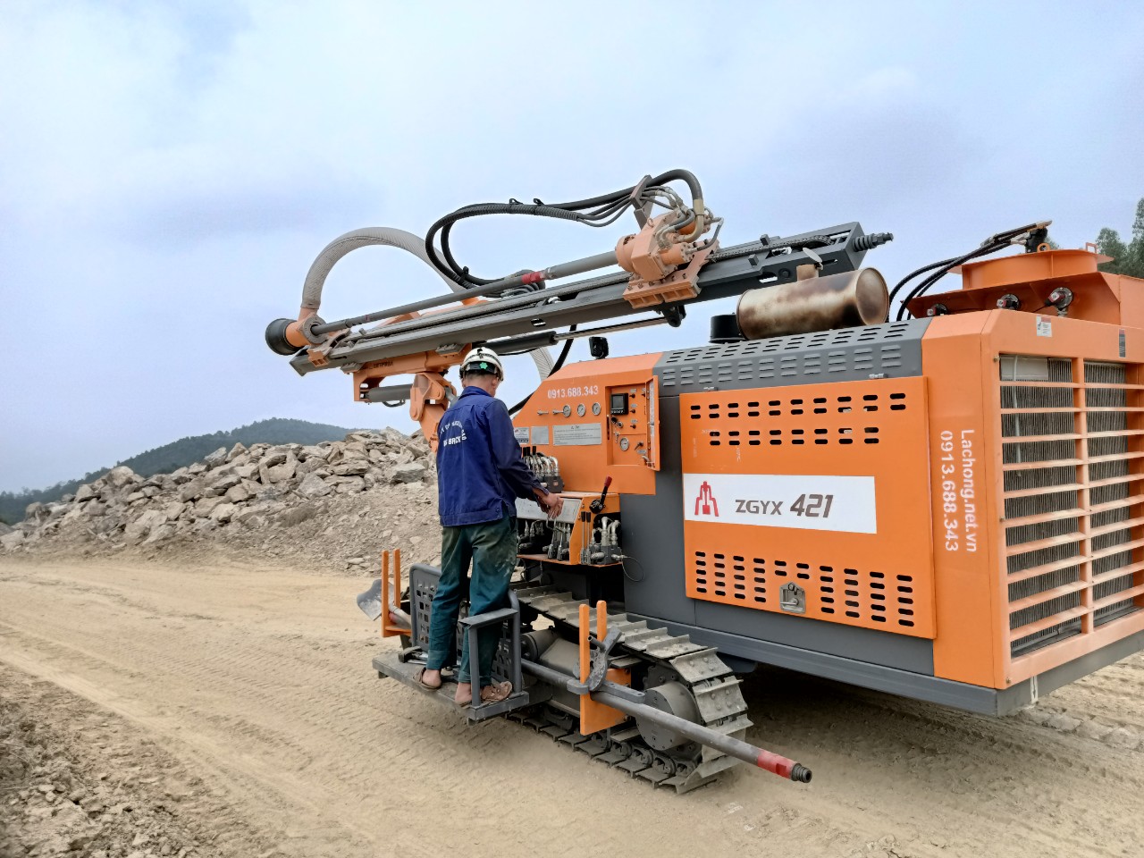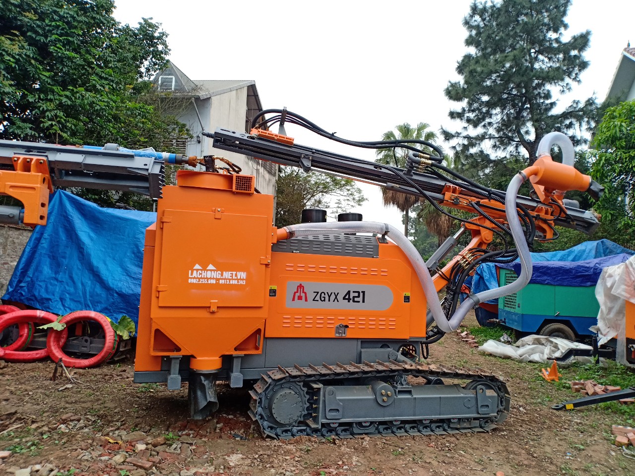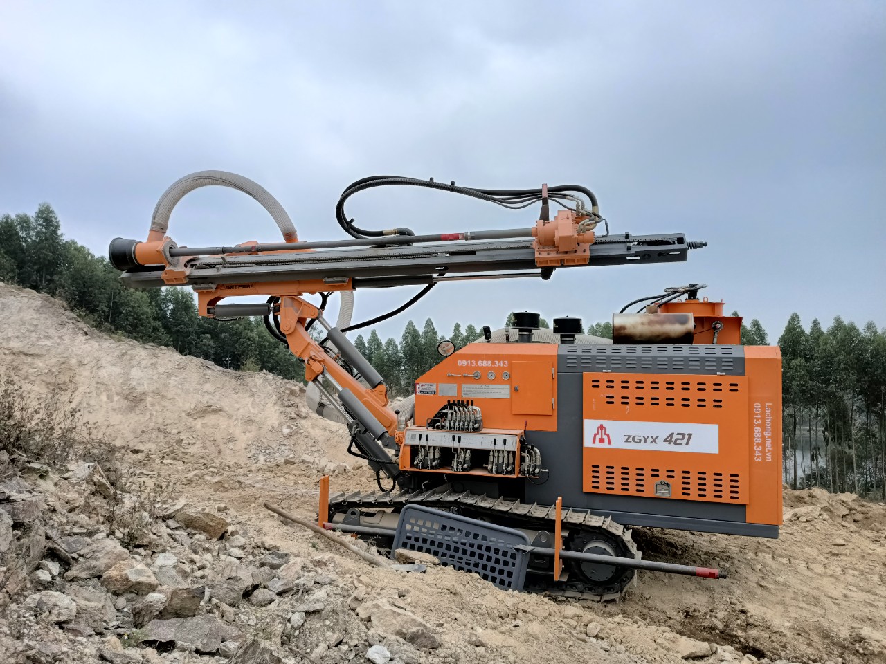 Máy khoan đá tự hành ZGYX-421 được tích hợp máy khoan và nén khí trên cùng 1 hệ thống, trang bị hệ thống hút bụi, Máy khoan được thiết kế để khoan được mọi địa hình, tháp khoan có thể xoay được 180 độ.